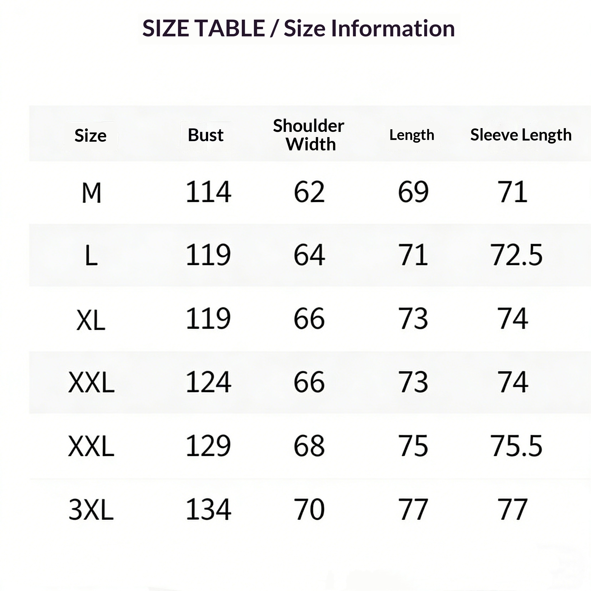 Sizes: M, L, XL, XXL, XXXL